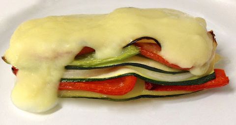 Ponemos un poco de aceite en una fuente para horno, y vamos colocando las capas: una tira de calabacín, una de pimiento rojo, otra de calabacín, cebolleta, calabacín, pimiento verde, tomate y acabamos con otra de calabacín. Entre capa y capa salamos un poquito y colocamos tantas como nos apetezca.