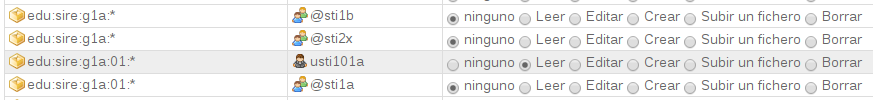 • Acumulables. En los permisos solo se marca uno pero el usuario o el grupo tiene todos los anteriores. Así, por ejemplo, si un grupo tiene permiso de Subir un fichero, también podrá leer, editar y crear páginas nuevas en ese espacio, pero sin embargo no podrá borrar los ficheros que se hayan subido.