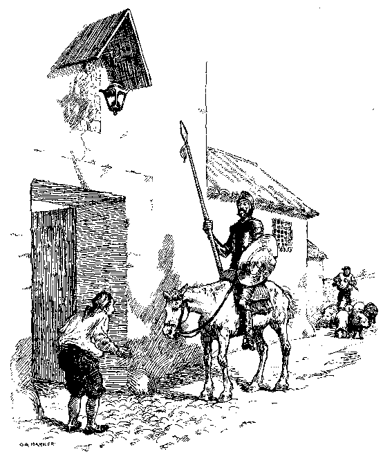 Estaban acaso a la puerta dos mujeres mozas, destas que llaman del partido, las cuales iban a Sevilla con unos arrieros que en la venta aquella noche acertaron a hacer jornada; y, como a nuestro aventurero todo cuanto pensaba, veía o imaginaba le parecía ser hecho y pasar al modo de lo que había leído, luego que vio la venta, se le representó que era un castillo con sus cuatro torres y chapiteles de luciente plata, sin faltarle su puente levadiza y honda cava, con todos aquellos adherentes que semejantes castillos se pintan. Fuese llegando a la venta, que a él le parecía castillo, y a poco trecho della detuvo las riendas a Rocinante, esperando que algún enano se pusiese entre las almenas a dar señal con alguna trompeta de que llegaba caballero al castillo. Pero, como vio que se tardaban y que Rocinante se daba priesa por llegar a la caballeriza, se llegó a la puerta de la venta, y vio a las dos destraídas mozas que allí estaban, que a él le parecieron dos hermosas doncellas o dos graciosas damas que delante de la puerta del castillo se estaban solazando. En esto, sucedió acaso que un porquero que andaba recogiendo de unos rastrojos una manada de puercos -que, sin perdón, así se llaman- tocó un cuerno, a cuya señal ellos se recogen, y al instante se le representó a don Quijote lo que deseaba, que era que algún enano hacía señal de su venida; y así, con estraño contento, llegó a la venta y a las damas, las cuales, como vieron venir un hombre de aquella suerte, armado y con lanza y adarga, llenas de miedo, se iban a entrar en la venta; pero don Quijote, coligiendo por su huida su miedo, alzándose la visera de papelón y descubriendo su seco y polvoroso rostro, con gentil talante y voz reposada, les dijo: