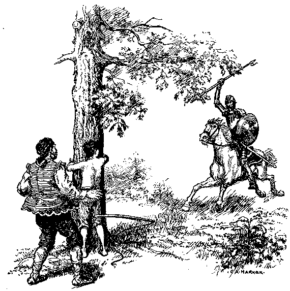 Y, asiéndole del brazo, le tornó a atar a la encina, donde le dio tantos azotes, que le dejó por muerto.