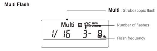 - Potencia del destello. En forma de fracción (1/4, 1/8, 1/16, 1/32, 1/64, 1/128) indica la potencia del destello, siendo 1/4 la máxima potencia y 1/128 la mínima. No se puede configurar a potencias mayores por los tiempos de recarga del flash y para evitar sobrecalentamientos.
