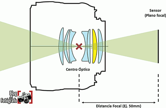 Centro óptico. Es el punto en donde los rayos de luz se cruzan dentro del objetivo y son dirigidos hacia el sensor. Dicho punto se encuentra muy cercano a donde se encuentra el diafragma.