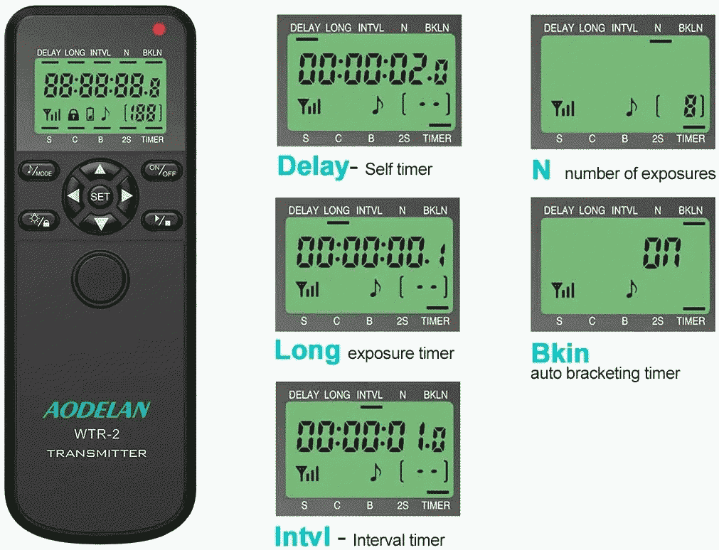 • El Aodelan WTR-2 tiene dos modos: disparador y temporizador. Funciona como un temporizador inalámbrico y un sistema de liberación remota del obturador con el receptor WTR-2(R) que se conecta a la cámara y el temporizador WTR-2(T) que controla el receptor.
