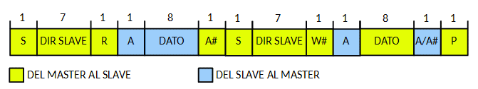 • Durante un cambio de dirección dentro de una transferencia, la condición de Start y la dirección del esclavo son ambos repetidos, pero con el bit R/W invertido. En el ejemplo lee un dato y luego escribe un dato.