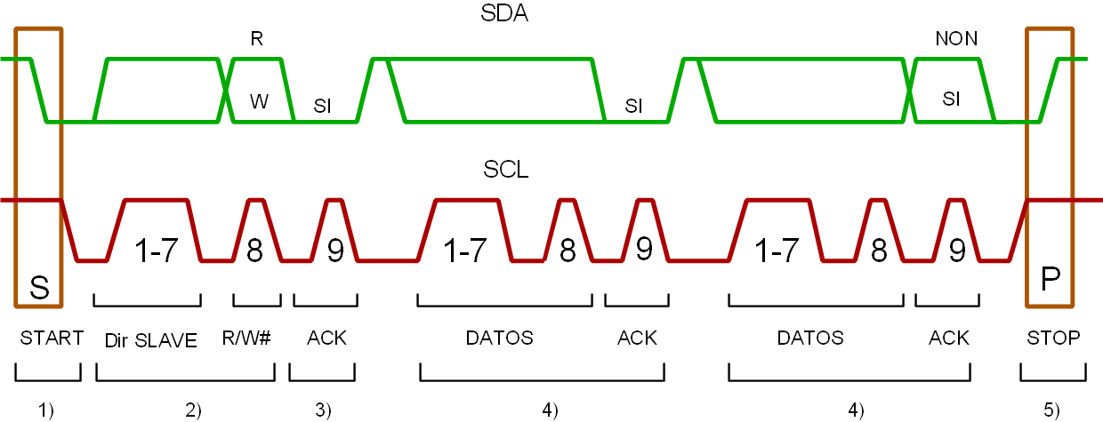 ACKReconocimiento- Precede al primer byte de datos. Lo provoca en SDA el receptor de datos, indicando su aceptación del byte precedente.