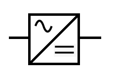 • El símbolo empleado para representar una fuente de alimentación en un esquema eléctrico es el que se ve a continuación. Como se puede ver, hace referencia a su función de convertir CA en CC.