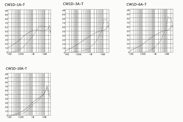 - Atenuación típica del filtro. Por CISPR 17/50Ω sistema [——Modo común; - - - - - Modo diferencial]
