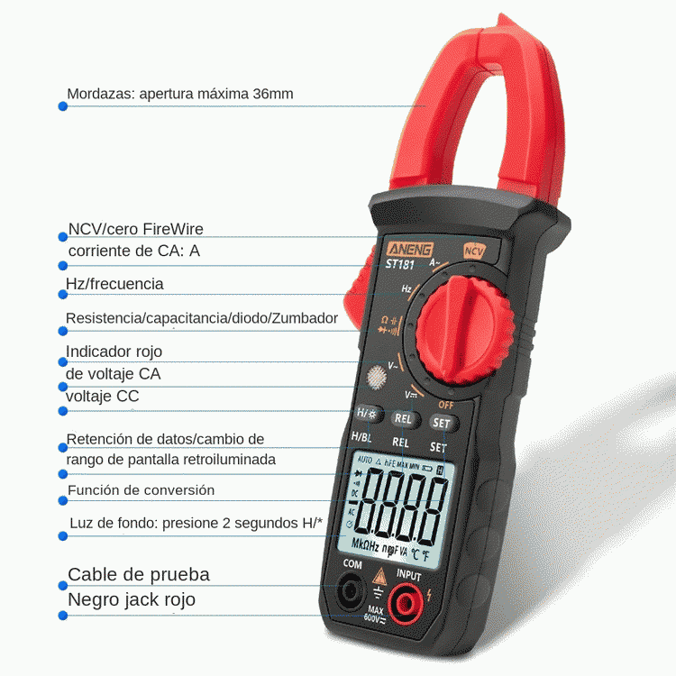- Puede medir voltaje CA/CC, corriente CA, resistencia y prueba de continuidad.