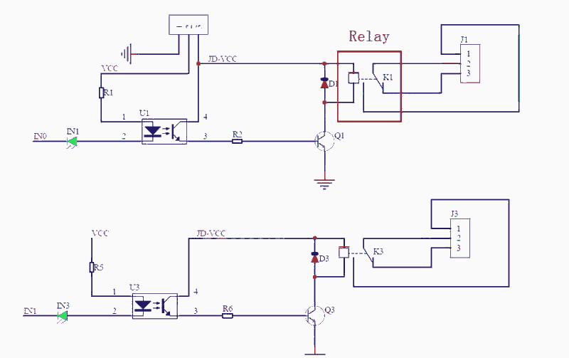 0lógico a la entradaINpara activar el relé correspondiente. VCC: Son los 5 V de la placa del microcontrolador, para completar el circuito de la entrada del optoacoplador.GND: No le encuentro sentido como parte de la entrada optoacoplada, y por tanto aislada del circuito de los relés. Supongo que es la masa del circuito final de los relés y está puesta en este conector para usar por defecto como alimentación de los relés la propia de la placa del microcontrolador. De esta forma van a este conector todos los cables: Las salidas del microcontrolador y la alimentación.