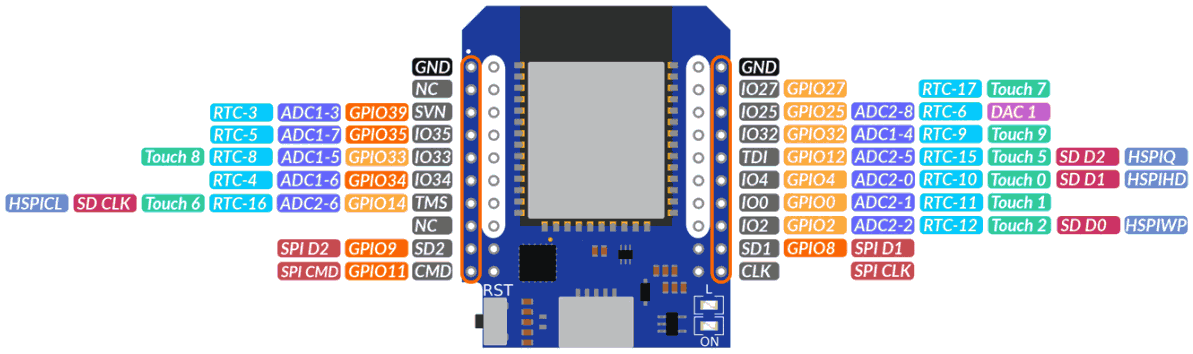 Ver la fuente de esta páginaRevisiones antiguasEnlaces a esta páginaExportar a PDFExportación a ODTVolver arriba Share via Share via... Twitter LinkedIn Facebook Pinterest Telegram WhatsApp Yammer Reddit TeamsImprimir × Público ⇒ Tecnología ⇒ Lenguajes de programación [ESP32] Placa D1 mini ESP32 Patillaje Manuales Patillaje placa D1 mini ESP32 Leyenda de los pines Pines interiores Pines exteriores doc/tec/prg/uc_esp32/d1mini_pin.txt Última modificación: 2025/11/04 21:43por 216.73.216.22