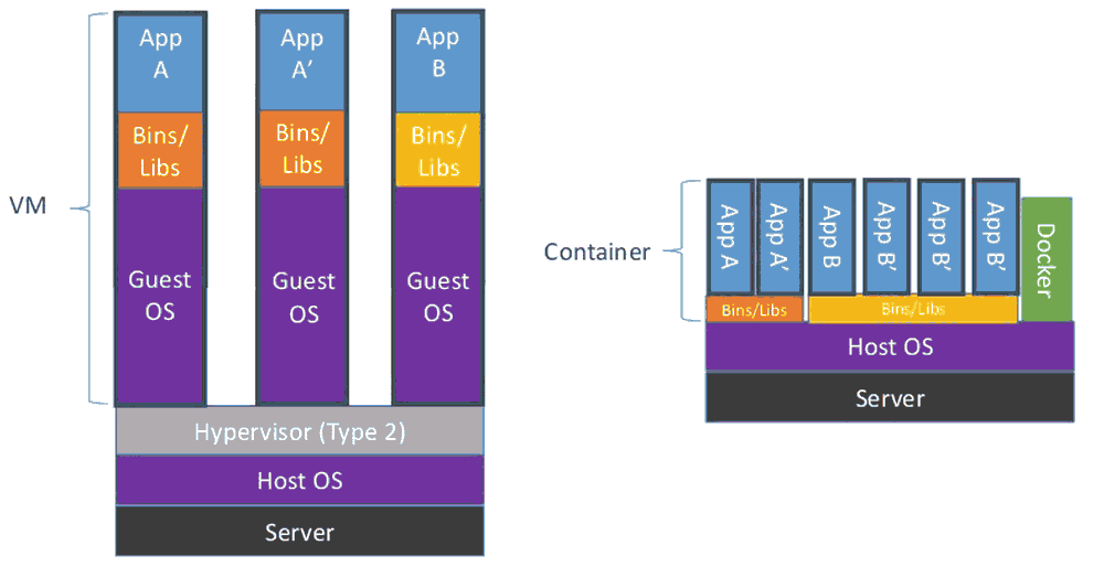En la imagen adjunta podemos ver esta diferencia entre el enfoque de las máquinas virtuales y el utilizado por Docker.