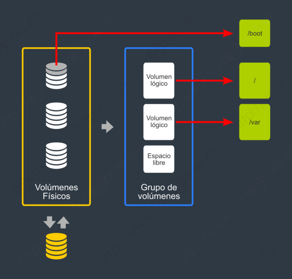 lvcreate. y con los comandoslvextenylvreducese puede cambiar su tamaño. - Los volúmenes lógicos se crean a partir de los volúmenes físicos disponibles y se les asigna un tamaño y un nombre. Estos volúmenes lógicos se pueden gestionar como si fueran particiones normales en un disco duro, pero en realidad están compuestos de varias particiones en múltiples discos duros físicos.