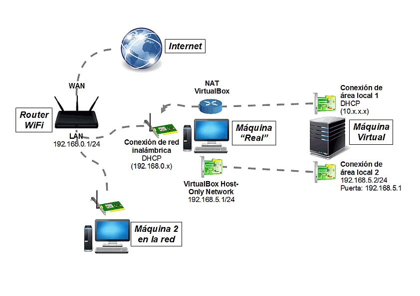 • El host actúa como un dispositivo NAT para permitir a la máquina virtual salir a Internet. La máquina virtual recibe su configuración de red desde un servidor DHCP integrado en VirtualBox, que la pondrá en la red 10.0.2.0/24.