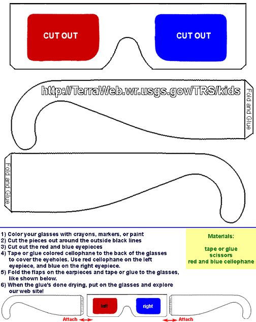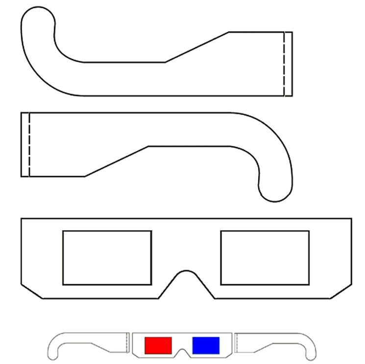 4. Recorte en papel tipo celofán o acetato tintado en rojo intenso y preferiblemente algo oscuro, o impreso en acetato con tinta transparente y densa, y en otro azul verdoso intenso, una o más láminas rectangulares por cada color que harán de lentes cromáticas. Procure elegir un material tintado transparente que permita ver a su través con el máximo posible de nitidez. Las láminas han de tener una forma algo mayor que los huecos de los armazones obtenidos anteriormente para poder unirlas y pegarlas a continuación en los bordes de dichos huecos.